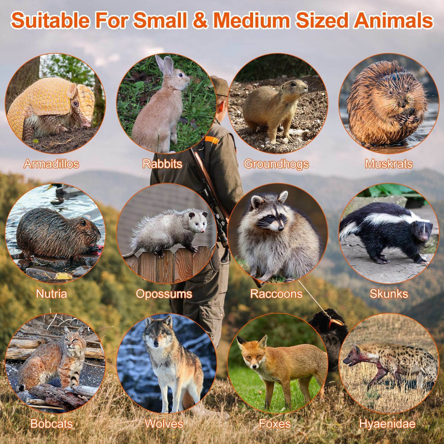*Wide Applications*:Our animal traps are suitable for a variety of small and medium sized animals,like raccoons,rabbits,groundhogs,foxes,feral cats,skunks,and so on,can be used in the woods,meadows,deserts,fields,gardens,yards and many other places.