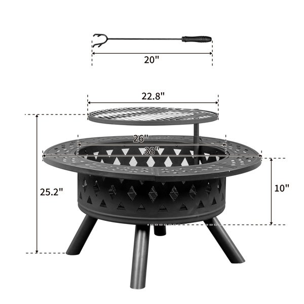 Multi-Functional outdoor fire pit,This 38'outdoor fire pit has a large cooking grill area, perfect to fit many people around for a bonfire in the patio, yard or garden. The barbecue grill the height can easily be adjusted for perfectly toasted or grilled treats over the fire.