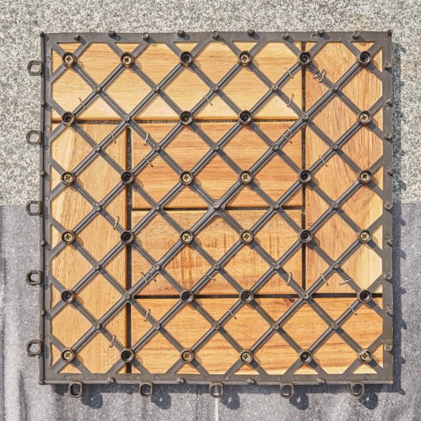 Product FeaturesPattern: 6 puzzle slats per tileOutdoor covering for patios, decks, balconies, porches, walkways, pools and hot tubsIndoor covering for garage floors, basement floors and bathroom floorsPre-treated, expertly kiln-dried, extremely durable Acacia HardwoodProduct is weather-resistant that can be used on porch or patioBacked with unique plastic interlocking grid for easy installationFast snap-together installation with no nails, staples or glueEasy to remove, re-arrange and re-lay tilesInterchangeable styles to create patternsWood slats permit water to flow through