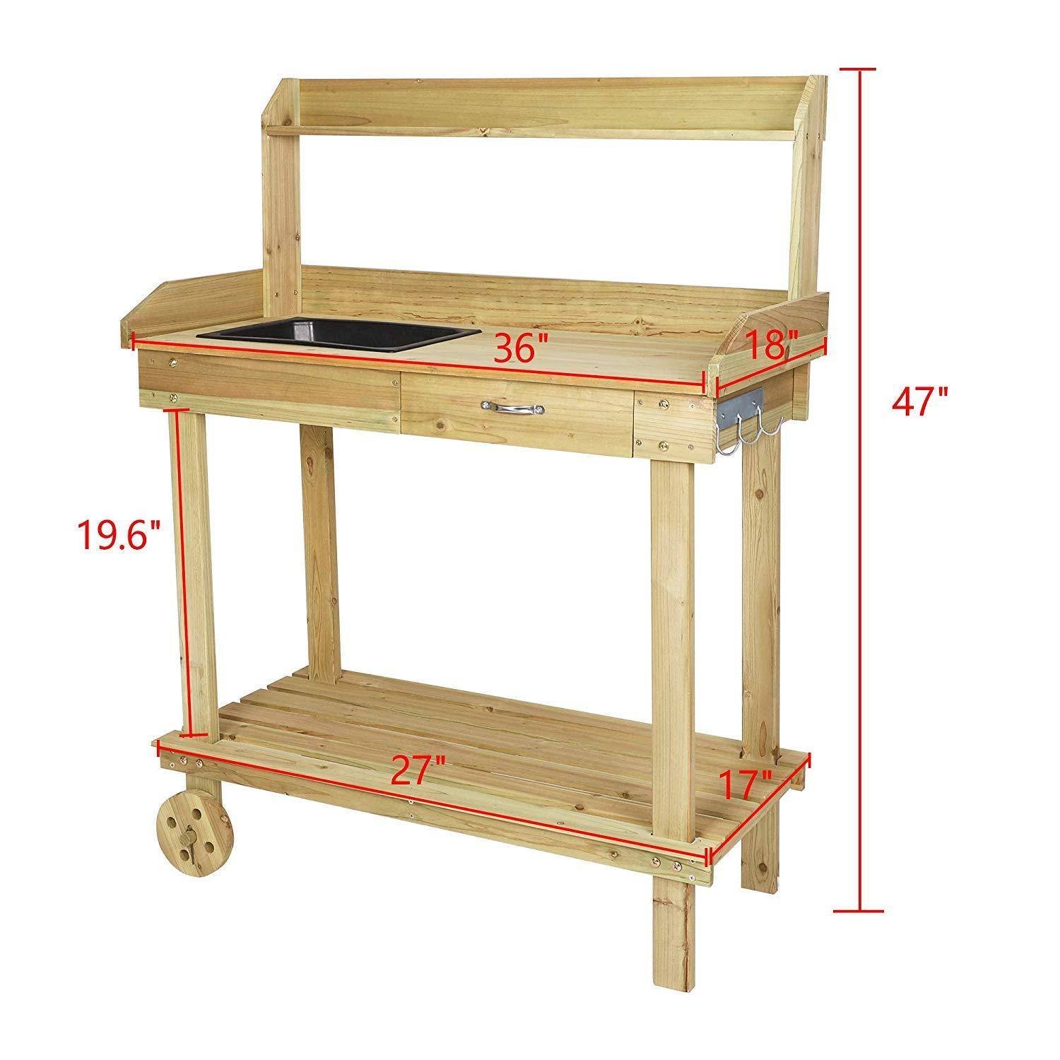 Stylish Gardening Table: Wooden potting benches help keep your garden area clean and organized; Nice-look will fit nicely in your backyard; patio. And it will be a great assistant for your gardening tasks.Sturdy & Durable: Made of natural solid fir wood; 0.6'' thickness board provide great support to hold flower pot; As for gardening tools; it can be used for a long time.Spacious Storage Spac: Dimension: 36" L x 18" W x 47" H; This garden work table constructed with side hooks; drawer; tabletop shelf; and open shelf; Provide enough place to hold your gardening tools.Easy Set-Up: Every part of the plant potting table is clear; you can follow the instruction to assemble it; if there any assemble problem; please feel free to contact us.Muti-Use: Weight: 28.4 lbs; The sink is removable; convenient to clean the soil; It would make a good craft bench; potting bench; coffee bar; or outdoor bar station for a patio.