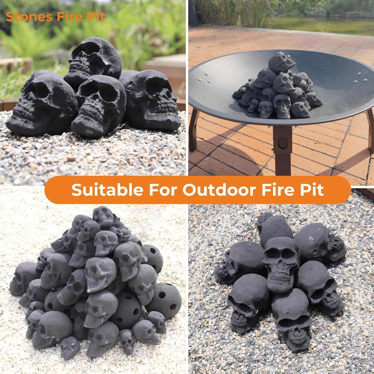 I highly recommend our skull fire logs to you. It's really, really, really cool!It has a total of 4 sizes, the largest is no bigger than a palm, the smallest is just a thumb. Therefore, his adaptability is particularly strong, it can be used in candlesticks, alcohol stoves, and can also be combined in fire pits and fireplaces, wherever it is sure to be the focus. Each one of our skull firepit heads is handmade, you can fully feel the vividness of their shapes, each one is very similar, but they are not the same, you put them there, the shapes are very vivid. We specially set 7/10/12 as a group, making it very easy to put together, you can just buy one to use the size you need, but also try different sizes of wonderful combinations, it will definitely decorate your party, let everyone marvel at your creativity. Package Included: 7pcs ceramic Skull logs set: "6.1 x 5 x 5.8cm" ceramic skulls for fire pit 4 Different Sets Size: 7pcs skull gas logs set: "7 x 5 x 7cm" firepit skulls large 7pcs ceramic Skull logs set: "6.1 x 5 x 5.8cm" ceramic skulls for fire pit 10pcs Skull firelogs set: 5pcs "4.3 x 2.5 x 3.4cm" fireplace skulls and 5pcs "5 x 4 x 4cm" ceramic skulls for fire pit 12pcs firepit skull logs set: 3pcs "5 x 4 x 4cm" skulls for fire pit, 3pcs "6.1 x 5 x 5.8cm" skull fire logs, 3pcs "4.3 x 2.5 x 3.4cm" skull fire pit stones,3pcs "7 x 5 x 7cm" human skull fire pit Experience a spine chilling Halloween with our Fire Pits Skulls!