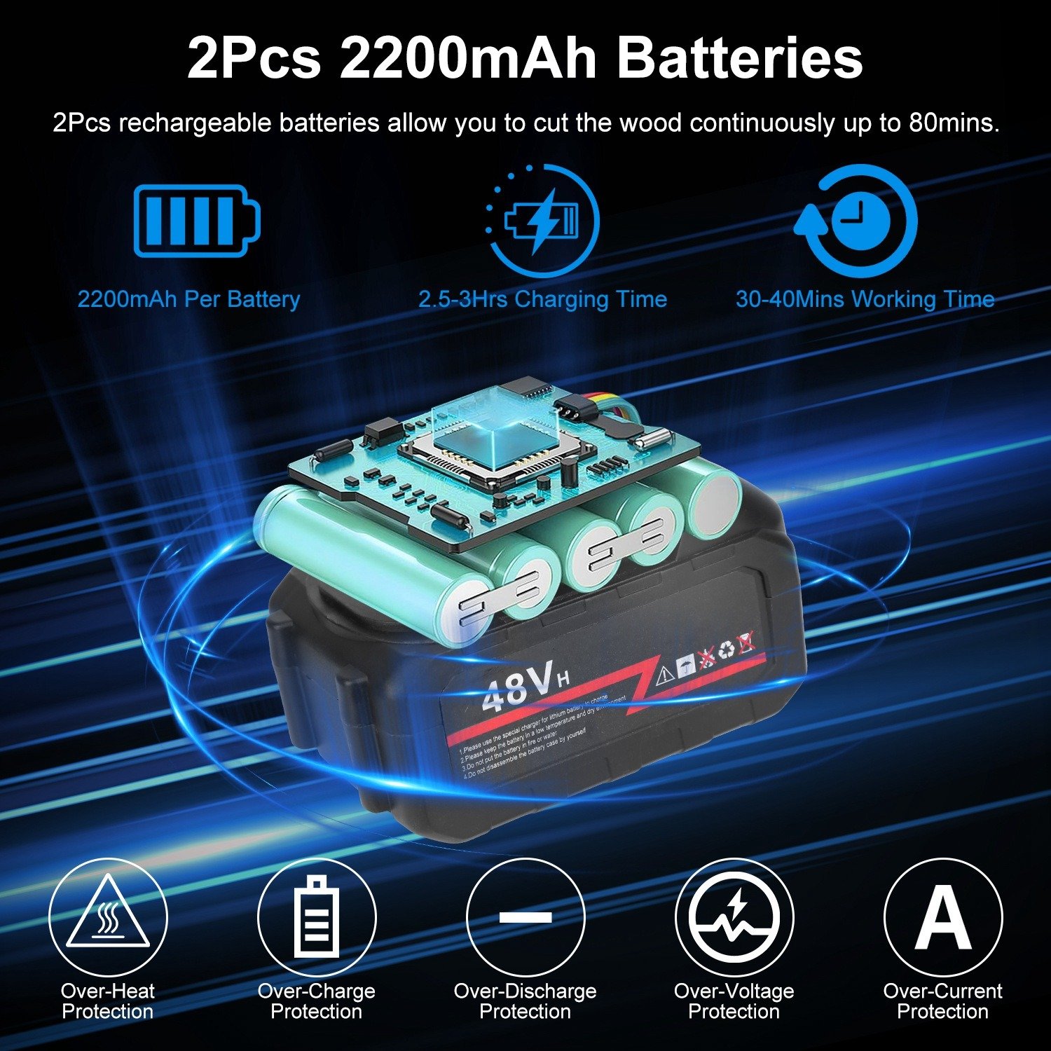 *2Pcs 6000mAh Batteries & Cordless Design*:2Pcs 2200mAh rechargeable batteries allow you to cut the wood continuously up to 80mins. Built-in over-heat/over-charge/over-discharge/ over-voltage/over-current protection,the battery can provides you with safe using. Besides,its lightweight and cordless design ensure effortless wood cutting,tree pruning and gardening without a sore hand.