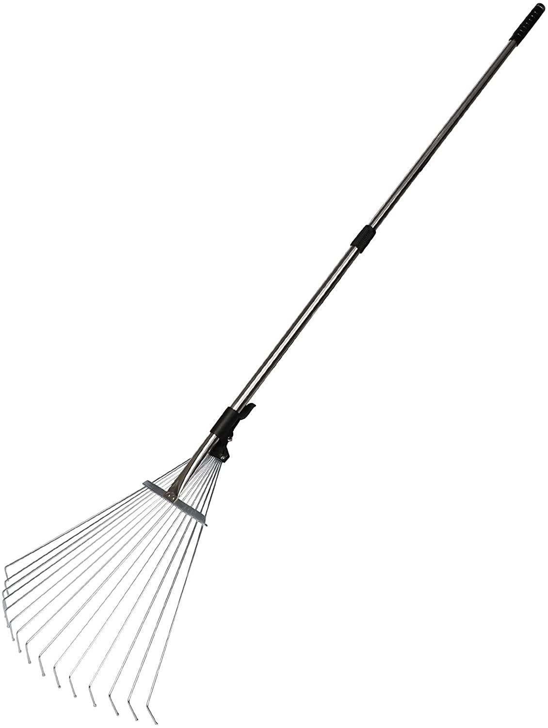 62.6 Inches Long - Long handle garden leaf rake which could less bend down and less fatigue during long time work. Please noted that this tool is not meant for cement or heavy-duty debris.Adjustable - Designed with expandable 7.5'-20' width fan folding head which can be locked any position in between. Wide head great for you to quickly clean leaves, small debris off lawns. 7.5' width suitable for tight areas like under hedges or between flower beds.Sturdy & Durable - Our products are made of high-quality stainless steel which is anti-rust and not easy to bend or break. The 0.76-inch diameter stainless steel handle makes the steel tines more stable.Non-slip & Comfortable - The black handle at the bottom of the rake is made of high-strength and good-tenacity plastic and has a comfortable non-slip design.Humanized Design - The well-designed smooth spherical rake tip will not damage grassroots or plants during use. The adjust-ability of the rake head makes for easy storage which can easily be stored on a shelf or in a corner.Specification: