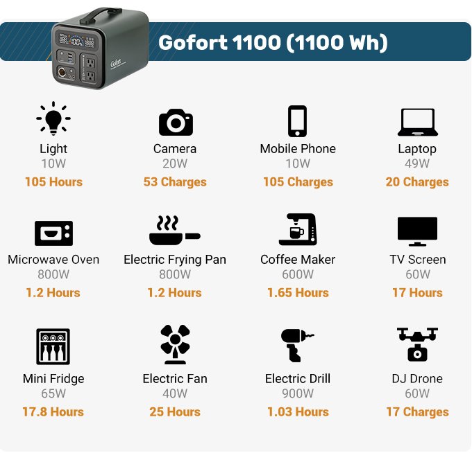 [1100Wh Battery Power Outdoors]Plug in and switch on Gofort UA1100 portable power station you can walk to the mini fridge(65W); take out a fresh bear to match the sandwich just did by a mini electric grill (760W); sit beside a fan(40W); watching videos with the laptop(49W) in front you while a string of warm bright lights(20W) glowing above enlighten your summer camping night.
