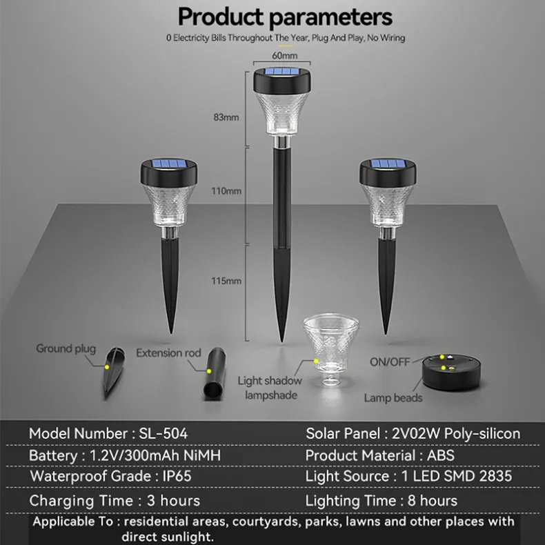 The solar lights outdoor is easily assembly, installation and free-maintenance. Just turn on the switch under solar panel, connect the lampshade, tube and stake. Inserted into ground or soil, the solar patio light with sensor will light up at night, turn off at dawn automatically. Essential decoration and lighting for your backyard.